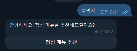 - 봇 명령 수행 시 "/"를 사용해야 되나 MessageHandler 사용으로 "/" 없이 입력 된 "밥먹자"를 감지