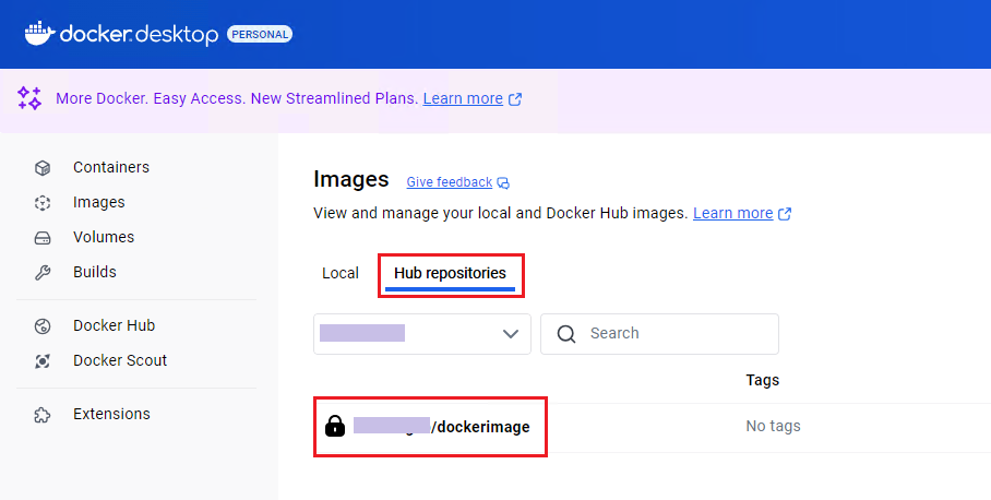 - docker.desktop에서 "Hub repositories"를 선택해서 확인