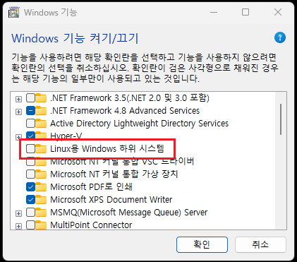 - "Linux용 Windows 하위 시스템" 체크 해제 후 확인