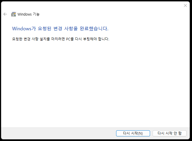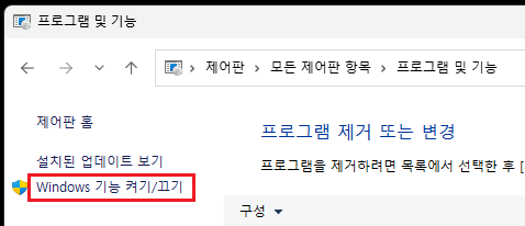 - "제어판 -> 프로그램 제거 또는 변경 -> Windows 기능 켜기/끄기" 선택
