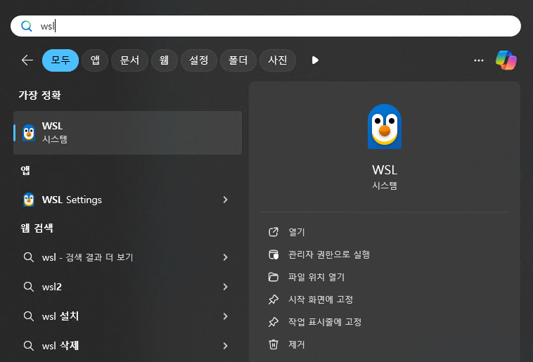 - 검색창에 wsl 을 입력하면 앱이 검색되나 제거는 되지 않음.