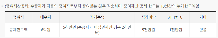 - 10년(증여일 기준)간 배우자 6억, 미성년자 자녀 2천, 성인 자녀 5천까지 공제