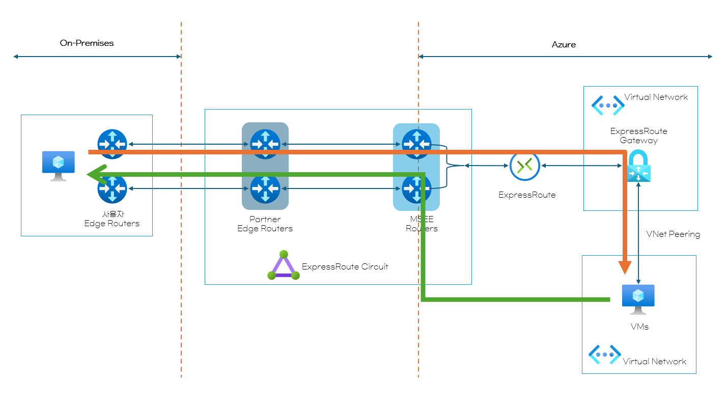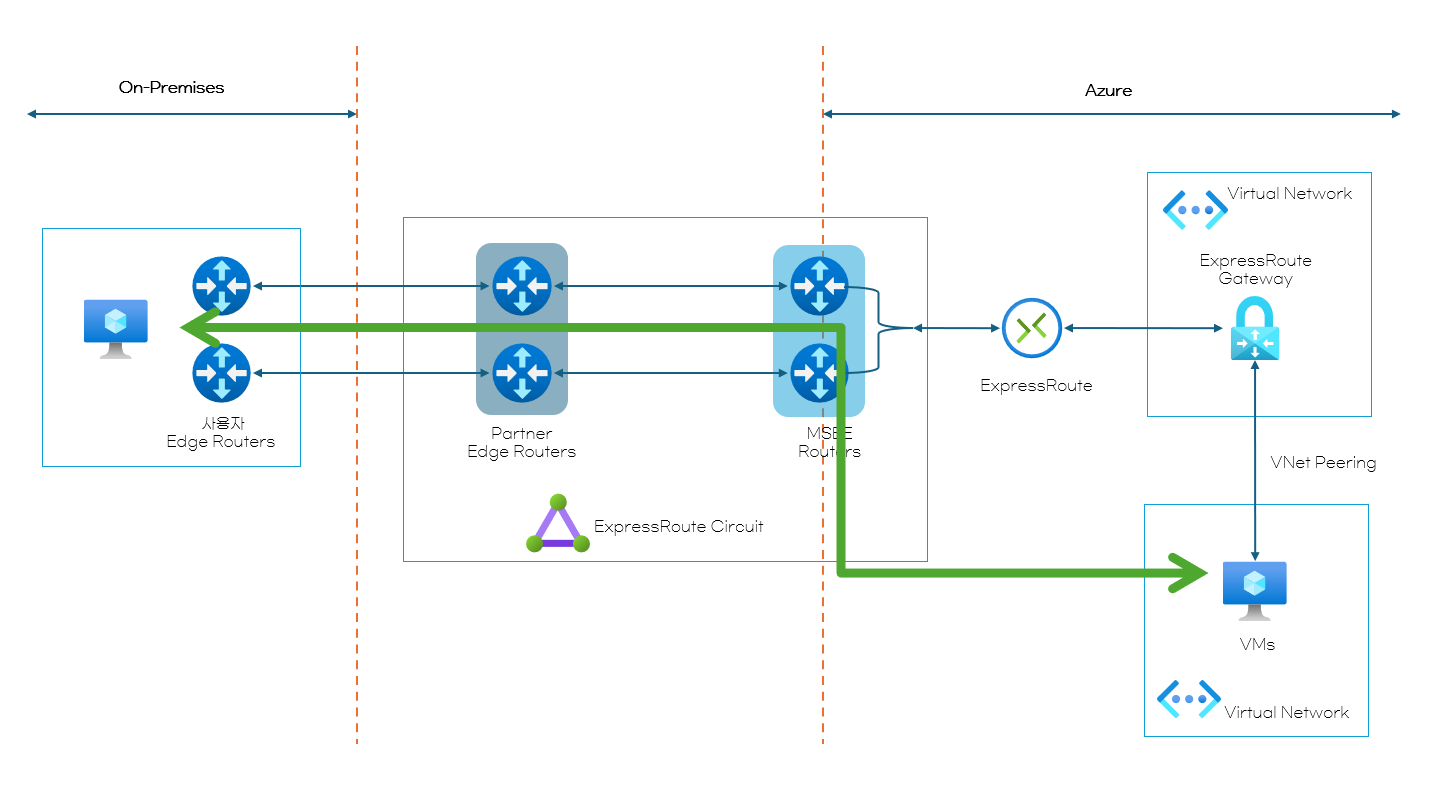 - (녹) Azure에서 온프레미스로 가는 트래픽은 ExpressRoute Gateway를 우회하여 MSEE Route로 직접 전달