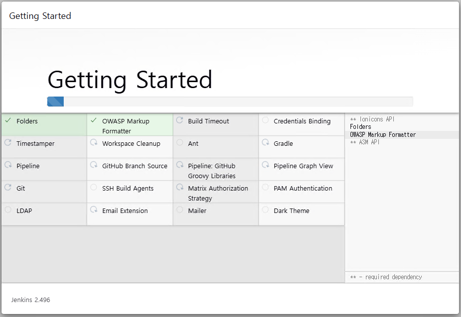 - Install suggeted plugins 선택하여 초기 플러그인 모두 설치