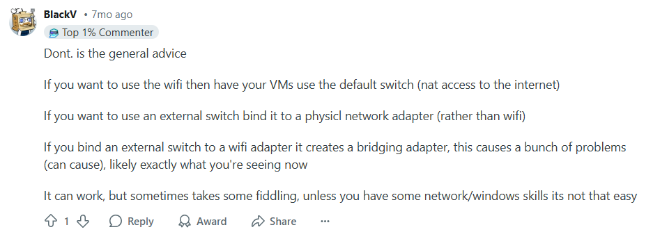 노트북에 Hyper-V를 구성하고 외부네트워크 가상 스위치를 wifi로 설정 했더니 노트북에서 특정 사이트 접속이 안되는 현상이 발생함.