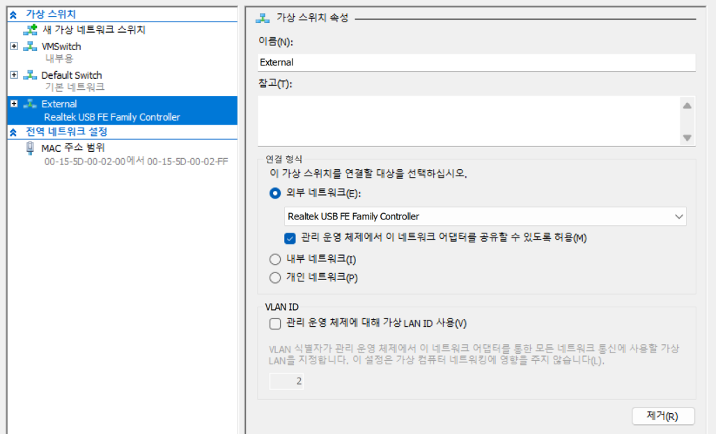 가상 스위치에서 외부 네트워크 wifi 구성 삭제 후