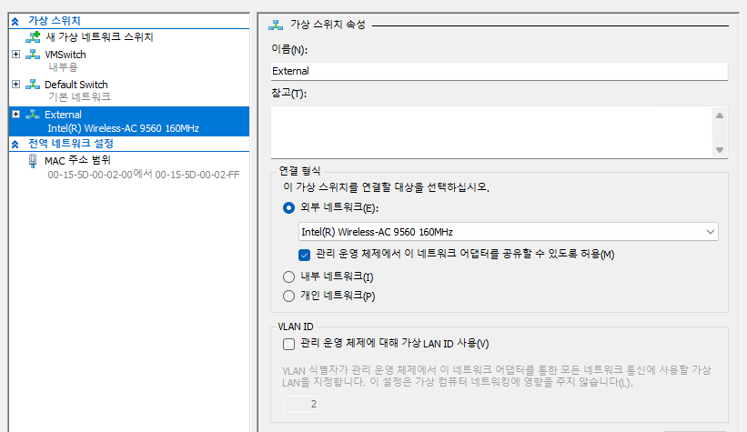 가상 스위치에서 외부 네트워크를 wifi로 구성 시