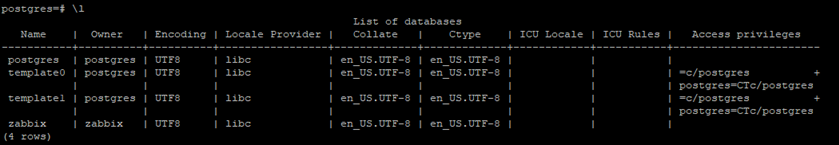 postgres=# GRANT ALL PRIVILEGES ON DATABASE zabbix TO zabbix;