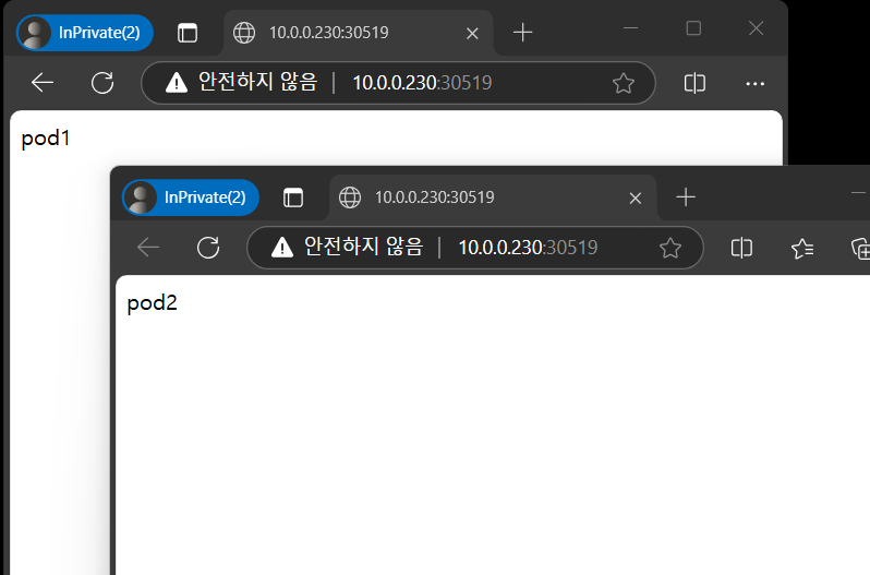 - http://10.0.0.230:30519 동일 포트로 접속하여 2개 pod 호출 확인