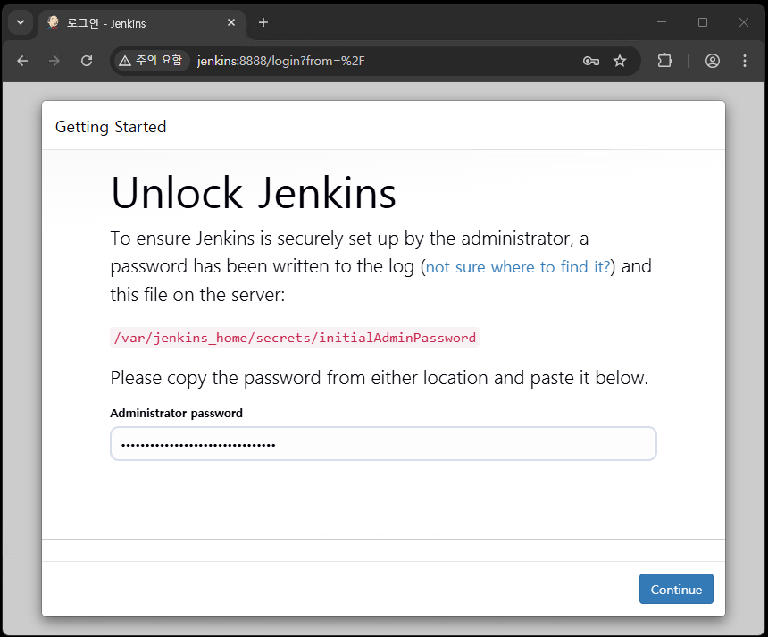 - Jenkins 웹페이지 접속(http://도커호스트IP:8888) 후 docker logs 에서 확인한 패스워드 입력