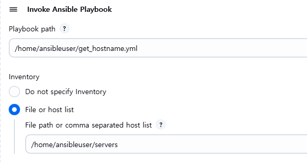 - Build Steps 항목에서 Invoke Ansible Playbook 선택 (경로 지정 및 실행 계정 등록)