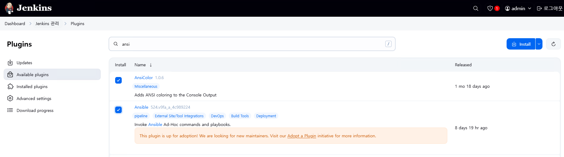 - Available plugins 선택 후 ansi 검색 후 AnsiColor과 Ansible 설치