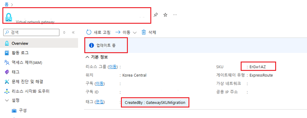 - 태그 부분에 "CreatedBy: GatewaySKUMigraion"이 표기되어 Gateway SKU Migraion으로 생성 된 리소스 확인 가능