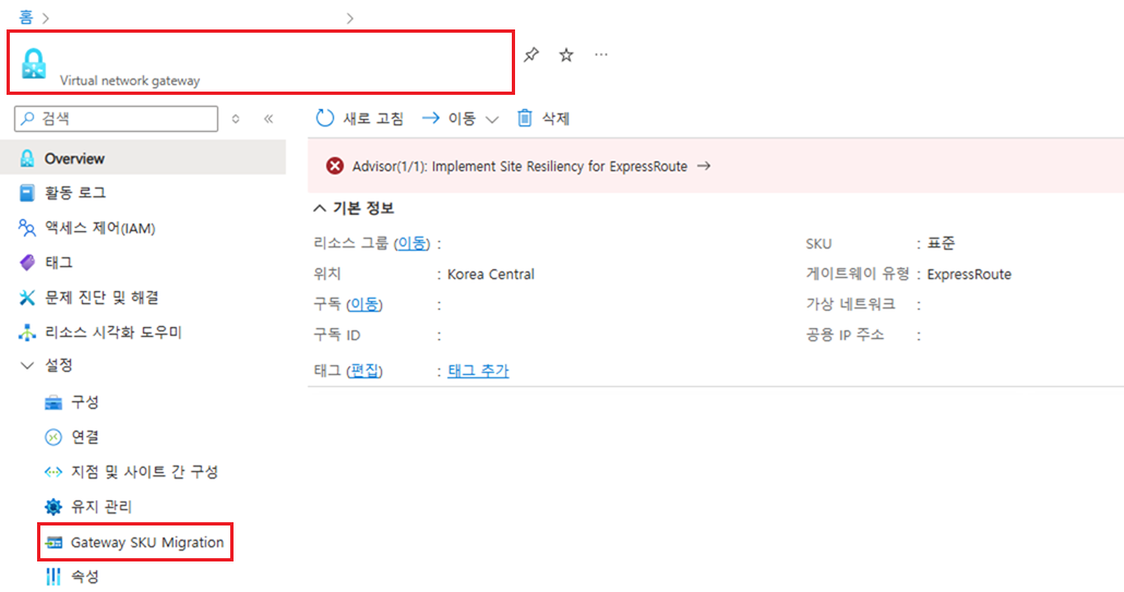 - SKU 변경으로 진행 시 서비스 다운타임이 발생하여 Azure 포탈에서 제공하는 "Gateway SKU Migraion"을 사용하여 무중단으로 진행