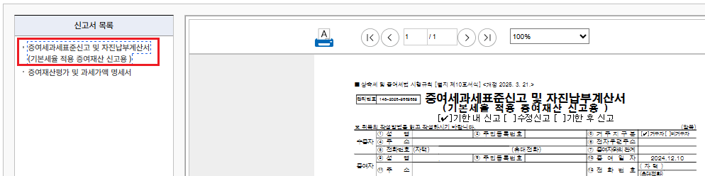 - "신고내역 조회(접수증,납부처)" 클릭 후 "신고서 제출목록" 조회 후 "접수번호(신고서보기)" 클