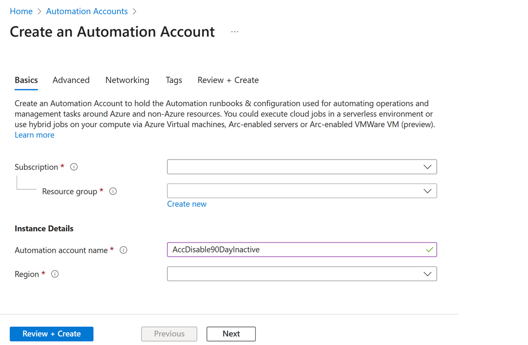 - Automation account name 설정 후 나머지는 기본 값으로 진행.
