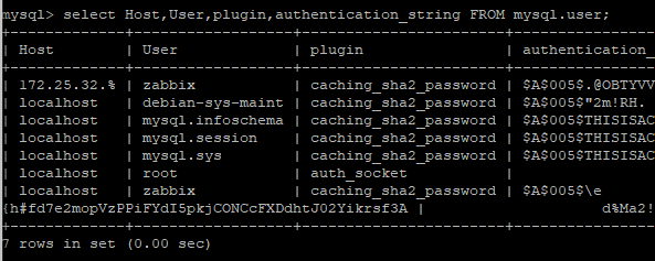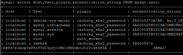 mysql> select Host,User,plugin,authentication_string FROM mysql.user;