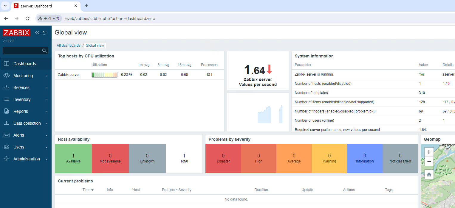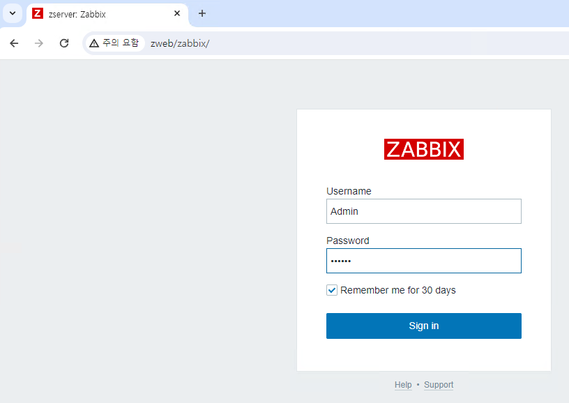 - 초기 id/비번: Admin/zabbix (대소문자 구분)