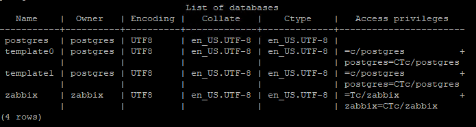 postgres=# GRANT ALL PRIVILEGES ON DATABASE zabbix TO zabbix;