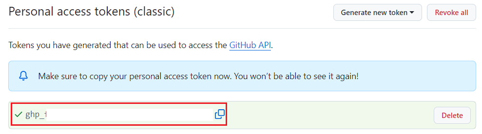 - "Personal access tokens" - > "Tokens(classic)" - > "Generate new token" -> " Generate new token(classic)" 클릭