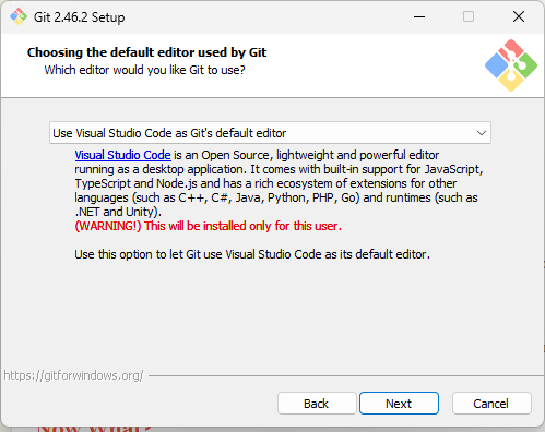 vscode를 기본 툴로 사용할거라 "Use Visual Studio Code as Git's default editor" 선택