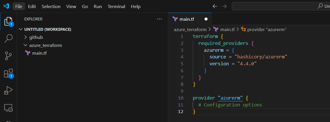 - 공식사이트(https://registry.terraform.io/providers/hashicorp/azurerm/latest/docs)를 참고하여 Azure 공급자 등록