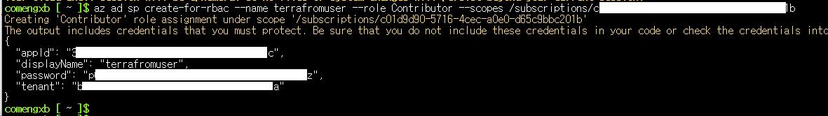- az ad sp create-for-rbac --name <계정명> --role Contributor --scopes /subscriptions/< subscription_id_or_subscription_name>