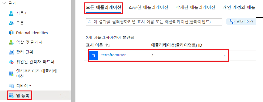 - "Microsoft Entra ID" -> "앱 등록" -> "모든 애플리케이션" 선택