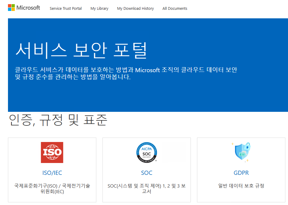 | Microsoft Service Trust Portal | Microsoft 클라우드 서비스의 보안, 개인정보 보호, 규정 준수에 대한 정보와 문서 제공 |